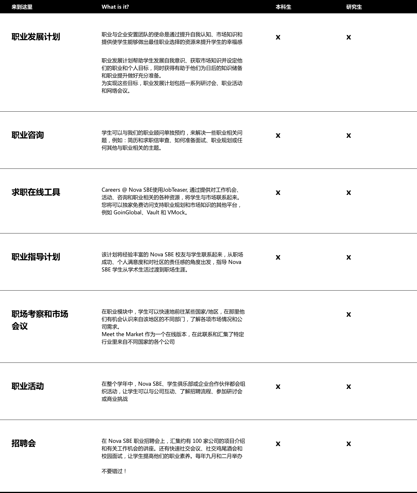 无论您是本科生还是硕士生,我们的 Nova SBE 的职业发展团队都有相对方案可以帮助您开辟通往成功职业生涯的道路。我们的服务如下: